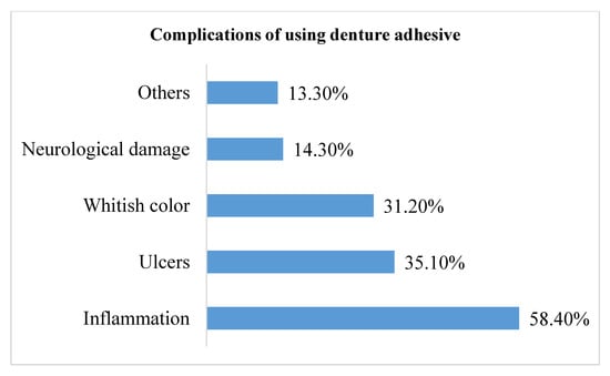 Even though DAs have many advantages, they do have some disadvantages. DAs can harbor bacteria and cause oral mucosa irritation necessitate cleaning dentures thoroughly [25]. In the present study, most of the participants reported inflammation to be the most common complication, followed by ulcer and whitish discoloration on the oral mucosa (Figure 1). Evidence suggests that long-term use of DAs can cause polyneuropathies linked with spinal cord damage as a consequence of the high absorption of zinc in DAs [26,27]. Moreover, a previous study has shown that only 20% of the participants knew the adverse effects of zinc-containing DAs [28]. Similarly, another study reported that most general practitioners and other specialists were unaware of extended use of zinc-containing DAs, resulting in neurological damage [11]. In the present study, half of the participants thought that the improper use of DAs can cause denture stomatitis, and they thought that prolonged use of denture adhesives with ill-fitting dentures can cause residual ridge resorption. Taken together, it is important that appropriate measures are taken to provide comprehensive knowledge to dental practitioners regarding the possible complications of DAs and how to avoid them.