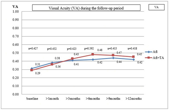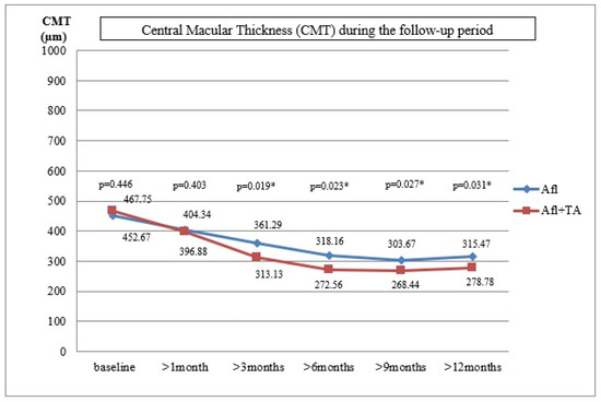 Our findings indicate that combined aflibercept + TA therapy already reduced CMT after one month, and the trend remained the same during the entire follow-up period (1st month: p = 0,031, 3rd month: p = 0.028, 6th month: p = 0.018, 9th month: p = 0.012, 12th month: p = 0.011). At the end of the 12-month follow-up period, CMT was approximately 67.7% lower than the initial values (278.78 ± 85.46 µm vs. 467.67 ± 143.53 µm; p = 0.007). This anatomical improvement was accompanied by a functional increase in VA. VA was significantly higher compared with the initial values after one month and throughout an entire year (1st month: p = 0,025, 3rd month: p = 0.021, 6th month: p = 0.017, 9th month: p = 0.016, 12th month: p = 0.018). After a year, VA was approximately 55.2% higher than the initial values (0.45 ± 0.61 vs. 0.29 ± 0.14; p = 0.011).