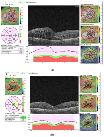 - Jovanovic, S.; Sarenac Vulovic, T.; Radotic, F.; Toncic, Z.; Zivkovic, M.; Petrovic, N. Quantitative analysis of uveitis macular edema in multiple sclerosis patients receiving deep posterior sub-Tenon’s triamcinolone acetonide injection. Ophthalmic Res. 2017, 58, 1–7. [Google Scholar] [CrossRef]