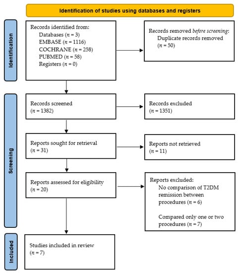 A total of 1432 (Embase 1116, PubMed 58, Cochrane 258) records were identified. After removing 50 duplicates, 1382 papers were screened using the title and abstract. One thousand one hundred and fifty-one articles were excluded as they (1) did not investigate T2DM remission, (2) only studied one or two of the three bariatric procedures or included revisional procedures, (3) were comments/letters/systematic reviews/meta-analysis/conference abstracts, and/or (4) were not in English. A total of 20 full papers were read. Thirteen were excluded as they did not compare T2DM remission after bariatric surgery (
