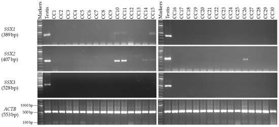 In the female patients, the mRNA levels of the SSX1, SSX2, and SSX3 genes were validated using a panel of RNAs obtained from the NC tissue samples from five female Saudi patients to determine the testis specificity of the mRNAs. No detectable expressions of the SSX1, SSX2, and SSX3 genes were found in any of the examined NC or CC tissue samples from the female patients (Figure 4).