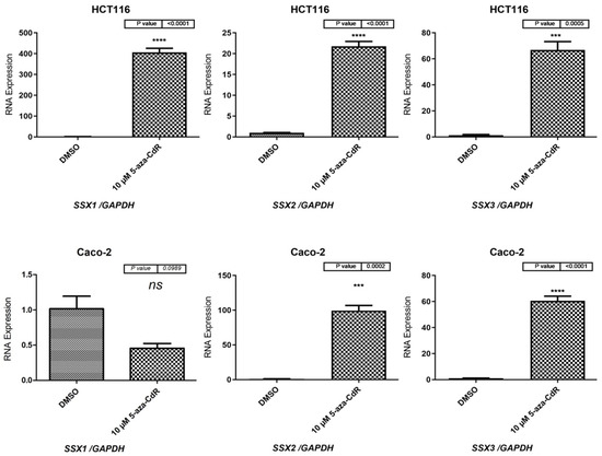 qRT-PCR results for SSX1, SSX2, and SSX3 in HCT116 and Caco-2 cells after treatment with 10 µM of 5-aza-2′-CdR for 72 h. The bar graphs show the SSX1, SSX2, and SSX3 expression levels in the HCT116 and Caco-2 cells before and after treatment with 5-aza-2′-CdR. DMSO was also utilized as a solvent for the 5-aza-2′-CdR solution and was applied to the control HCT116 and Caco-2 cells. GAPDH mRNA was used as a reference to normalize the gene expression levels. The standard error of the mean for three independent experiments is represented by the error bars. *** p ≤ 0.001; **** p ≤ 0.0001. Abbreviation: qRT-PCR: quantitative reverse transcription polymerase chain reaction; ns: not-significant.