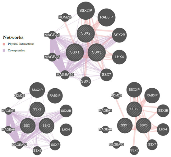 The default setting of GeneMANIA was used to build a gene–gene interaction network for analyzing the SSX gene functions. The core node represented the SSX gene members that were surrounded by 10 nodes, defining the other genes that were strongly connected to the SSX genes in terms of both co-expression and physical interactions (top of Figure 9). The SSX1, SSX2, and SSX3 genes were highlighted as being co-expressed with 10 other genes in the following ranking: SSX2IP, RAB3IP, SSX2B, LHX4, SSX7, SSX5, MAGEA12, MAGEA6, MAGEA1, and KDM2B (colored purple in the bottom left of Figure 9). However, the GeneMANIA program revealed that the interconnected network of the SSX2IP, RAB3IP, SSX2B, LHX4, SSX7, SSX5, and KDM2B genes had real physical interactions (colored pink in the bottom right of Figure 9). Furthermore, the analysis revealed that the co-expressions and physical interactions accounted for 18.53% and 81.47%, respectively.
