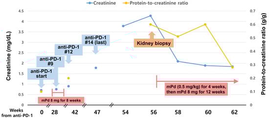 The patient changed chemotherapy and received 200 mg pembrolizumab single-agent chemotherapy for lung cancer from February 2020. The treatment resulted in partial response, as the size of the mediastinal lymph nodes decreased, and the last (14th) dose was administered in March 2021. After the 9th pembrolizumab dose, the patient developed diffuse ground-glass opacity (GGO) lesions around the pulmonary fibrosis and newly enlarged neck lymph nodes around the left internal jugular vein less than 1 cm. The pulmonologist diagnosed ICI-related pneumonitis grade 1, and both GGO and neck lymphadenopathy were improved after treatment with 8 mg of methylprednisolone for eight weeks. The baseline serum creatinine level was 0.7 mg/dL, which increased to 1.8 mg/dL after the 14th dose of pembrolizumab (47 weeks of anti-PD-1 therapy; Figure 1). Since then, his condition deteriorated due to myalgia and diarrhea, and the anticancer treatment was hence discontinued. The patient’s diarrhea stopped, but generalized myalgia persisted, and he was hospitalized because his serum creatinine level had increased to 3.8 mg/dL. Prior to hospitalization, he had not taken any antibiotics, antirheumatic drugs, such as methotrexate and leflunomide, biologic agents, such as tumor necrosis factor (TNF)-α, or interleukin-2 receptor antagonists, proton pump inhibitors, and nonsteroidal anti-inflammatory drugs.