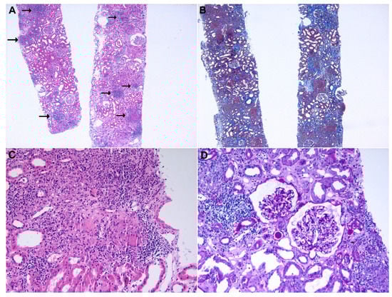 Histopathological findings of kidney biopsy. (A) Scattered discrete and uniform granulomas with lymphoid aggregates in the renal interstitium (arrows; hematoxylin and eosin; original magnification ×40). (B) A moderate degree of interstitial fibrosis and tubular atrophy (Masson’s trichrome; original magnification ×40). (C) Granulomas with tightly packed epithelioid cells and Langerhans cells with minimal lymphocytic cuffing (hematoxylin and eosin; original magnification ×200). (D) No significant pathological findings in the glomeruli (periodic acid-Schiff; original magnification ×200).