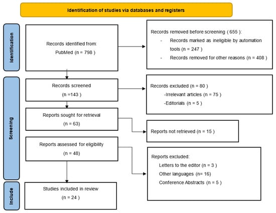 The initial search retrieved a total of 798 studies. We screened a total of 143 studies, and we excluded 119 articles as follows: irrelevant original studies to this review topic (n = 75), other languages (n = 16), conference abstracts (n = 5), articles not retrieved (15), and editorials or letters to the editor (n = 8). Finally, a total of 24 studies fulfilled our inclusion and exclusion criteria and were included in the systematic review as demonstrated in Figure 1.