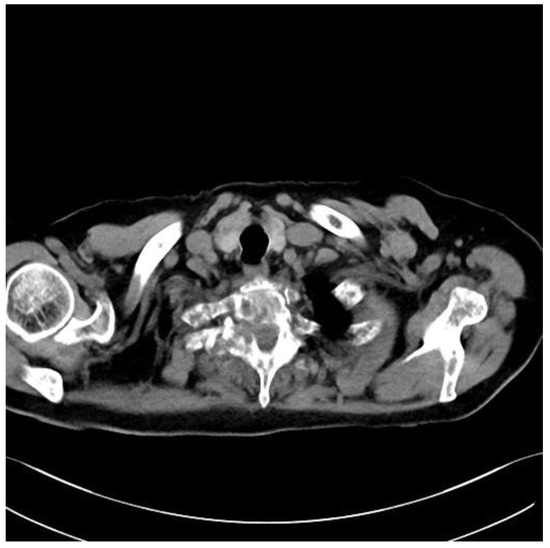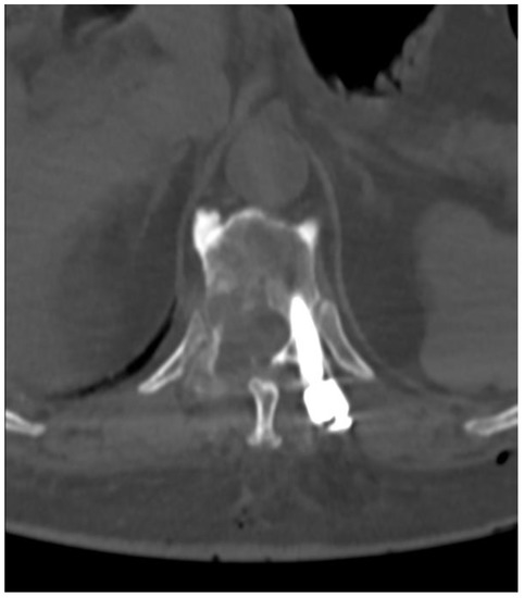 An 82-year-old patient was diagnosed with prostate cancer. For 2 weeks, he complained of severe pain syndrome of the thoracic spine with paraparesis MRC 4. A CT scan showed a metastatic lesion involving the right pedicle of the Th2 vertebra, modeling the dural sac at this level (Figure 3). It was 10 points on the SINS score. The patient was qualified for separation surgery with unilateral percutaneous fixation. The procedure was performed using endoscopic visualization. The material was successfully collected, and a free, pulsating dural sac was visualized at the end. There were no bleeding problems during the procedure that would restrict visualization. After the procedure, the patient reported a marked reduction in pain. He was transferred for further oncological treatment. The results of the histopathological examinations confirmed the prostate cancer metastasis. Due to the patient’s age and general condition, further treatment was palliative in accordance with his wishes. We do not have control MRI images. The duration of the surgery was 120 min.