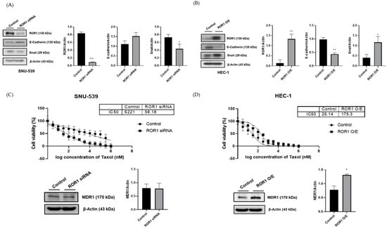 To examine the resistance to the anticancer drug, we identified the IC50 level of paclitaxel and the drug resistance marker, MDR1, in two cell lines. In the SNU-539 cell line, ROR1-silenced cells had a lower IC50 of Taxol (58.18 vs. 6221 nM); however, there was no significant difference in MDR1 expression levels (Figure 3C). In the HEC-1 cell line, ROR1-overexpressed cells had higher IC50 of Taxol (175.3 vs. 26.14 nM) and significantly increased MDR1 expression (Figure 3D). Original western blot replicates and densitometry readings/intensity ratio of each band are shown in Figures S2–S4.