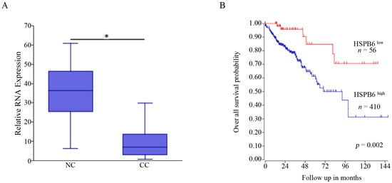 The expression of HSPB6 in CC relative to NC, as well as the link between HSPB6 presence and CC patients’ outcomes, was revealed using R2 genomic analysis and a visualization platform (https://hgserver1.amc.nl/cgi-bin/r2/main.cgi, accessed on 2 September 2022). According to this study (GSE8671), which contained a cohort of 32 samples taken from patients with CC and their adjacent NC (Figure 1A), HSPB6 was significantly downregulated in CC compared to NC. In addition, its high expression was correlated with good outcomes, whereas its low expression was correlated with poor outcomes (Figure 1B). Therefore, these data indicate the effect of HSBP6 absence on CC aggressiveness.