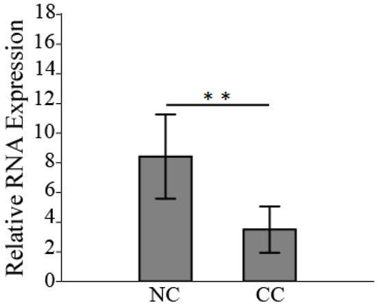 HSPB6 was poorly expressed in patients with CC. The average expression of HSPB6 in NC (10 samples) was elevated compared to its adjacent CC (** p = 0.002). The mean and SD of the three independent experiments were obtained. The unpaired Student’s t-test was applied to define significance.