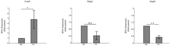 Hspb6 expression was detectable in tumorigenesis in Wistar rats. The expression of Ccnd1 (left panel), Ndrg2 (middle panel), and Hspb6 (right panel) was examined in NC- and DMH-induced CC isolated from Wistar rats. The expression of Ccnd1 was significantly 4-fold upregulated (* p = 0.02), and Ndrg2 expression was decreased in CC compared to NC (N.S; not significant). Hspb6 expression was also significantly poorly presented in the CC group compared to the NC group (** p = 0.003). The mean and SD of the three independent experiments were obtained. The unpaired Student’s t-test was applied to define significance.