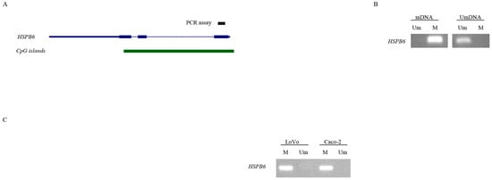 HSPB6 contains rich CpG islands at the promoter region and is methylated in LoVo and Caco-2 CC cell lines. (A) This shows the HSPB6 gene and the location of the Polymerase Chain Reaction assay, where the amplicon was amplified, and the distribution of CpG islands. (B) In the assay controls, the mDNA was fully methylated DNA and the UmDNA was unmethylated DNA. Um and M represent the unmethylated-specific primers and methylated-specific primers, respectively. (C) HSPB6 was methylated in the CC cell lines LoVo and Caco-2.