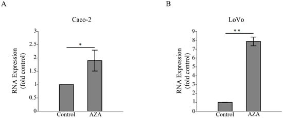 5-aza-2′-Deoxycytidine-stimulated HSPB6 expression. (A) The expression of HSPB6 was significantly increased in Caco-2 cells treated with 5-aza-2′-deoxycytidine (AZA) compared to Caco-2 cells treated with DMSO (control) (* p = 0.02). (B) The expression of HSPB6 was significantly increased in LoVo cells treated with 5-aza-2′-deoxycytidine (AZA) compared to LoVo cells treated with DMSO (** p = 0.002). The mean and SD of the three independent experiments were obtained. The unpaired Student’s t-test was applied to define significance.
