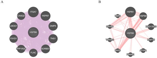 HSPB6 interaction at transcriptional and translational levels using the GeneMANIA database (genemania.org, accessed on 15 October 2022). The black nodes represent the 10 most important genes. (A) The diagram displays the interaction at the transcriptional level between HSPB6 and other genes, which are ordered from the strongest to weakest interaction, as follows: ITGA7, HSPB7, DMPK, TNS1, SORBS1, FLNC, PPP1R3C, FXYD1, LMOD1, and CASQ2. (B) The diagram displays the interaction at the transitional level between HSPB6 and other genes, which are ordered from the strongest to weakest interaction, as follows: HSPB1, HSPB8, HSD17B10, MAP1B, ATG4A, PNMA2, BAG3, YWHAG, CRYAB, and UBR3.