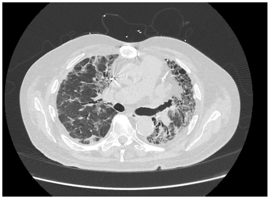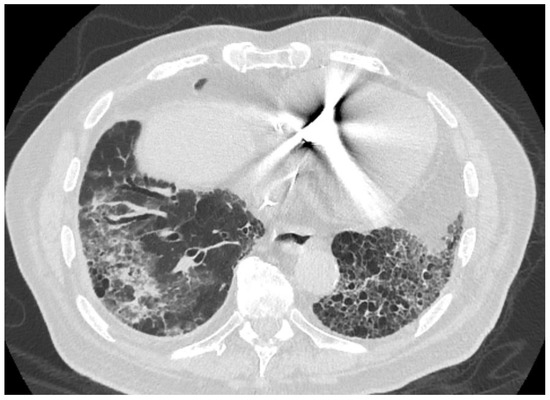 Axial view of chest computed tomography (CT) demonstrates typical honeycombing in the left lower lobe and traction bronchiectasis in the right lower lobe. The groundglass and consolidative opacity seen in the right lower lobe—which is not common in UIP/IPF—has been attributed to possible mild focal alveolar hemorrhage in the setting of thrombocytopenia or microaspiration inflammatory changes.