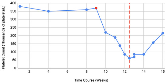 Demonstrates trend in platelet counts from the time of initiation of Nintedanib until it is stopped (red line). The red dot points towards the time when dose of Nintedanib was decreased from 150 mg orally two times per day to 150 mg orally daily due to gastrointestinal side effects.