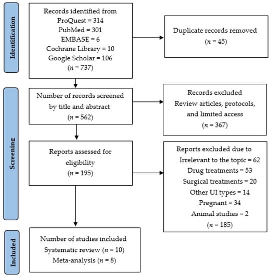 Quality checks were also performed to compare the abstracted data with the original articles. In the article search, a total of 737 results were obtained. One hundred and ninety-five articles continued to be relevant to this review, of which one hundred and eighty-five were excluded for the following reasons: inappropriate outcome for the purpose of this review, interventions using pharmacological or surgical treatments, other types of UI, pregnant women, studies with animals, and those that did not meet the inclusion criteria. At last, 10 relevant articles were found for the systematic review and 8 articles for the meta-analysis.