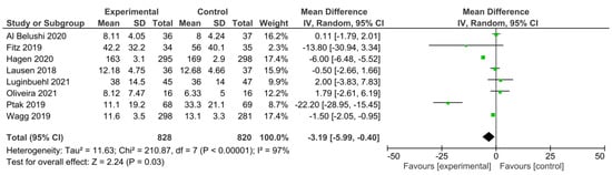 Eight studies were included to assess the QoL. Figure 2 shows a forest plot of a meta-analysis where the pooled MD of the QoL between the experimental and control groups was −3.19 with a CI [−5.99 to −0.40] and p = 0.03. A meta-analysis of these trials revealed that PFMT can mildly improve the QoL.