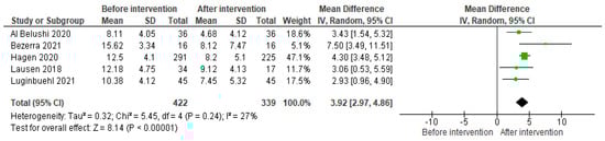 Five studies were included to assess the QoL before and after their interventions. Figure 3 shows a forest plot with data from the experimental groups before and after their interventions. The MD of the ICIQ-UI SF questionnaire was 3.92, with a CI [2.97–4.86] and p = 0.00001. A meta-analysis of these trials revealed that the ICIQ-UI SF improved approximately three points from the baseline in most studies, thus showing that the QoL of all the women of the experimental groups improved when performing supervised PFMT.