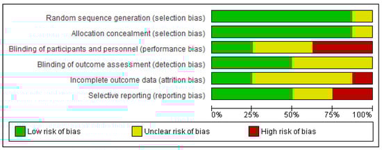 The risk of bias graph and the risk of bias summary are shown in Figure 4 and Figure 5. One study had an unclear risk of selection bias due to insufficient information provided on random sequence generation or allocation concealment [34]. Four studies reported adequate allocation concealment using sequentially numbered, sealed opaque envelopes [27,30,32,34].