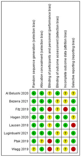 Three studies reported an unclear risk of performance bias [29,30,35], two studies reported a high risk of performance bias [32,33], and only two study reported a low risk of performance bias [27,28]. Since PFMT is an exercise-based therapy, it was not feasible to consider blinding the women or their health providers, as stated by four studies that showed an unclear risk in relation to blinding of the outcome assessment (detection bias) [27,28,32,34].