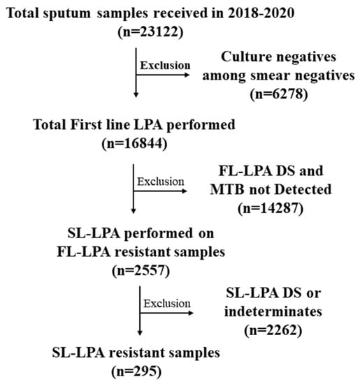 Sputum samples were processed by the standard N-acetyl-L-cysteine and sodium hydroxide (NALC-NaOH) decontamination procedure, as per the standard operating procedure (SOP) in the laboratory [,]. A smear was prepared from the deposit, and all smear-positive samples as well as culture positives among smear-negative samples were included in FL-LPA testing. Routinely, culture-negative samples among smear negatives were excluded from FL-LPA testing []. DNA was extracted using Genolyse® version 1.0, and FL-LPA was performed using GenoType® MTBDRplus version 2.0, as previously described []. FL-LPA drug-sensitive (DS) and M. tuberculosis-negative samples were excluded from SL-LPA testing. All first-line-resistant patients were included for second-line LPA (SL-LPA) using GenoType® MTBDRsl version 2.0 as reflex testing, as per the PMDT 2017 algorithm [].