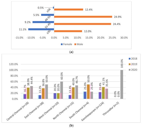 (a) Age and gender distribution of patients (n = 217). (b) District-wise referral of patients (n = 217). (a) Shows the distribution of male and female gender across the various age groups: ≤30, 31–45, 46–55, and ≥56 years. (b) Shows the district-wise (2b) distribution of study patients across districts of Central Chennai, East Chennai, West Chennai, North Chennai, South Chennai, Kancheepuram, and Tiruvallur.