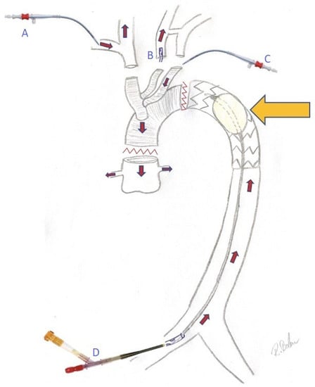 Perfusion strategy after deployment of the frozen elephant trunk. The yellow arrow indicates the inflated occlusion balloon placed in the stented part of the frozen elephant trunk. A cannula in the right axillary artery (A) provides initial whole-body perfusion as well as cerebral perfusion as soon as the brachiocephalic trunk has been clamped. A second cannula in the left carotid artery (B) may be used if necessary. Heart perfusion is provided through a cannula in one of the branches of the prosthesis (C). The ThruPort cannula is placed into one of the femoral arteries (D) and will perfuse the lower part of the body after the inflation of the occlusion balloon (yellow arrow).