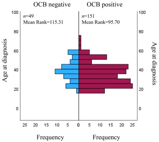 Positive CSF OCBs were found in 151 (75.5%) of the cases; 49 (24.5%) of them were negative. There were no statistically significant associations between OCB positivity status and sex. Furthermore, OCB positive patients (median = 35 (18–74)) were diagnosed with MS earlier than OCB negative patients (median = 39 (20–59), U = 3084, p = 0.039) (Figure 1). There were no relations between the OCB positivity results and patient age at the symptom onset, EDSS scores of the first and last visit and its change through time.