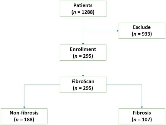 Of the 295 RA patients enrolled in this study, 107 (36.27%) had hepatic fibrosis (Figure 1). The group of patients with fibrosis was older (p = 0.02) and had higher values for albumin (p = 0.007), AST (p = 0.002), ALT (p = 0.001), creatinine (p < 0.001), INR (p = 0.02), and uric acid (p < 0.001) compared to the group with no fibrosis. There was no difference in sex, alcohol consumption, hemoglobin, white blood cell count, or platelet count. The values are given in Table 1.