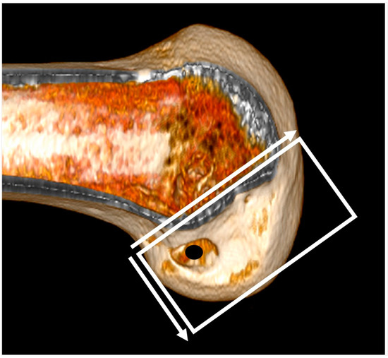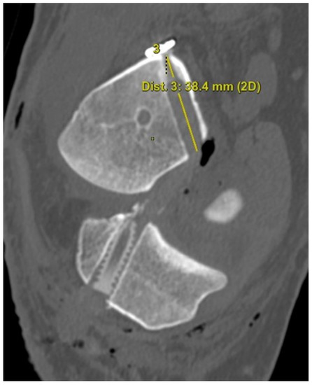 The 3D CT scans were imported into 3D software (AW Sever 3.2 PACS system, GE Healthcare; Chicago, IL, USA) for the assessments of the femoral graft bending angle and femoral tunnel length. The femoral graft bending angle was defined as the angle formed by the longitudinal axis of the femoral tunnel and the line connecting the intra-articular aperture of the tibial tunnel and the intra-articular aperture of the femoral tunnel (Figure 3). The femoral tunnel length was defined as the distance between the center of the extra-articular aperture of the femoral tunnel and the center of the intra-articular aperture of the femoral tunnel in a plane where the entire femoral tunnel could be viewed (Figure 4). Posterior wall breakage of the femoral tunnel was also checked.