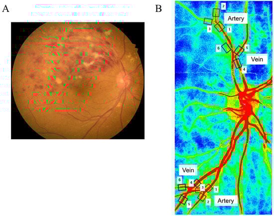 - Iwase, T.; Ra, E.; Yamamoto, K.; Kaneko, H.; Ito, Y.; Terasaki, H. Differences of Retinal Blood Flow Between Arteries and Veins Determined by Laser Speckle Flowgraphy in Healthy Subjects. Medicine 2015, 94, e1256. [Google Scholar] [CrossRef]
