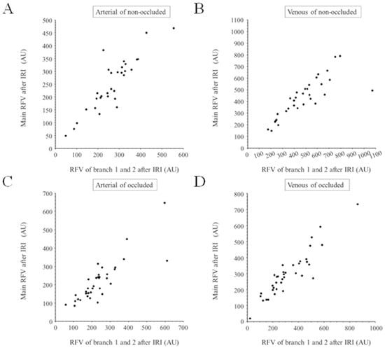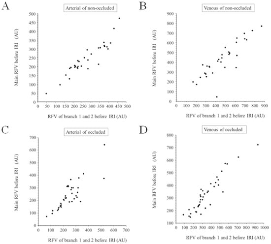 | Venous of the non-occluded region: branch 1 | 0.02 0.907 | 0.14 0.409 | 0.09 0.593 | −0.10 0.552 | 0.05 0.781 | 0.15 0.376 | 0.09 0.594 | 0.16 0.423 |