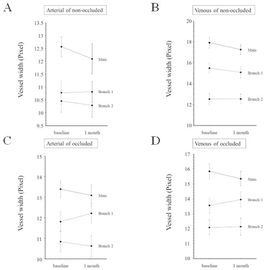 - Fukami, M.; Iwase, T.; Yamamoto, K.; Kaneko, H.; Yasuda, S.; Terasaki, H. Changes in Retinal Microcirculation After Intravitreal Ranibizumab Injection in Eyes with Macular Edema Secondary to Branch Retinal Vein Occlusion. Investig. Ophthalmol. Vis. Sci. 2017, 58, 1246–1255. [Google Scholar] [CrossRef] [PubMed]