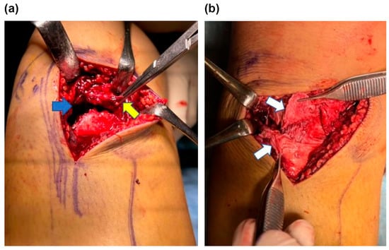 Intraoperative image of the right knee fracture area. (a) Disruption of the periosteum (yellow arrow) embedded in the fracture site (blue arrow). (b) Partial rupture of the patellar tendon (white arrow) was noted.