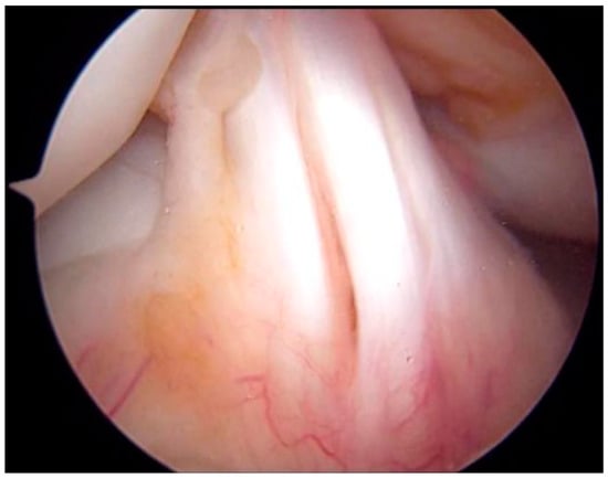 Arthroscopic image of the ACL in the right knee. ACL was segmented with no synovial coverage, but there was no obvious tearing. ACL, anterior cruciate ligament.