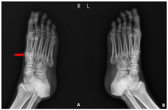 Preoperative plain radiographs showing osteoarthritis with joint space narrowing, sclerotic changes, and osteophytes in the first TMT (Tarsometatarsal) joint (arrow). (A) Oblique view of the site of injury, (B) oblique view of the contralateral side.