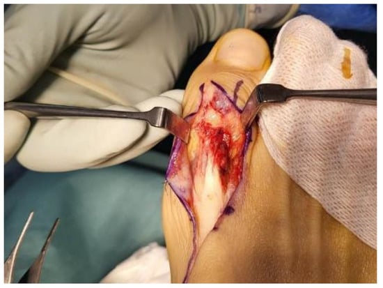 The EHL tendon was severed at a point 1 cm distal to the interpharangeal joint. Severe soft tissue adhesion along the EHL tendon was observed.
