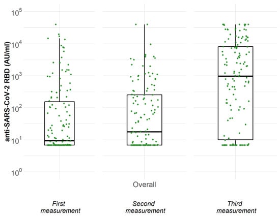 As presented in Table 2 and in Figure 1, only 33.6% (45 out of 134) of recipients who received the initial vaccination with two doses tested positive for anti-SARS-CoV-2 RBD-IgG antibodies, with a median (25th, 75th) antibody titer of 9 (7, 161) AU/mL. Approximately 3 months after the second dose, 41.8% (56 out of 134) tested positive with a median (25th, 75th) antibody titer of 18 (7, 251) AU/mL. Remarkably, when tested after administration of the third dose, a positive antibody response was detected in 69.4% (93 out of 134) recipients, with a median (25th, 75th) titer of 966 (10, 8027) AU/mL.