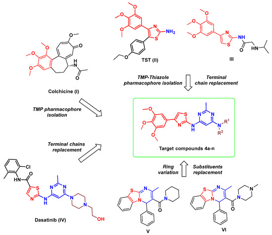 Trimethoxyphenyl (TMP) moiety of colchicine (I) is a key pharmacophoric structure to bind tubulin, and it inhibits malignant cell division and growth [3,4,5]. From this point of view, many microtubule-targeting agents bearing TMP have been developed as potent tubulin inhibitors for treating cancers in the past decade [6,7,8,9,10,11,12,13,14]. The TMP thiazole derivatives compound II (TST) and compound III are potent anticancer candidates with promising growth inhibitory action against various cancer cell lines [15,16,17,18]. Dasatinib (IV) is a multi-kinase inhibitor anticancer drug with N-(2-methylpyrimidin-4-yl)thiazol-2-amine pharmacophore [19,20,21]. Compounds V and VI, benzo [4,5]thiazolo [3,2-a]pyrimidine derivatives, are potent anticancer candidates with promising IC50 values against a range of different cancer cell lines [22].
