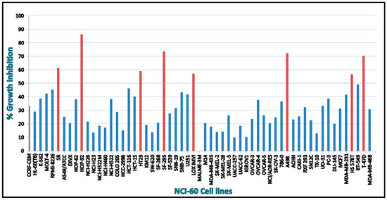The antiproliferative activity of compound 4b against the full NCI-60 cell line panel at 10 μM is shown in Figure 2. From these findings, it can be concluded that the best antiproliferative activity of compound 4b was against lung cancer HOP-92, CNS cancer SF-295, renal cancer A498, and breast cancer T-47D cell lines, and to a lesser extent against leukemia SR, colon cancer HT29, melanoma LOX IMVI, and breast cancer HS 578T cell lines.