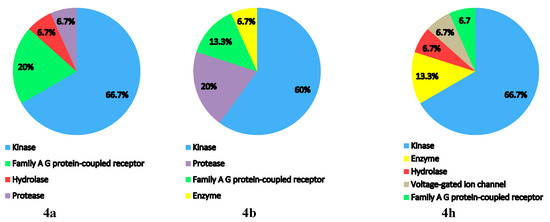 The most potent compounds, 4a, 4b, and 4h, were subjected to a structure similarity search (Molinspiration and Swiss TargetPredictors) to acquire certain insights about their potential molecular targets. Molinspiration concentrates on certain classes of drugs and calculates the specific activity scores for these classes. These bioactivity scores may be a proper measure to predict the target with the highest probability for the most potent synthesized compounds [35].