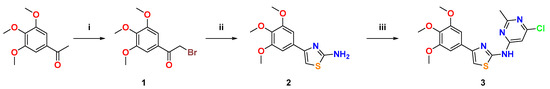The key intermediate, N-(6-chloro-2-methylpyrimidin-4-yl)-4-(3,4,5-trimethoxyphenyl)thiazol-2-amine (3), was prepared as shown in Scheme 1. First, 2-bromo-1-(3,4,5-trimethoxyphenyl)ethan-1-one (1) [29] was synthesized via bromination of 3,4,5-trimethoxy acetophenone. Then, compound 1 was refluxed with thiourea for 45 min to yield compound 2 [30]. Next, the key intermediate 3 was achieved by reacting compound 2 with 4,6-dichloro-2-methylpyrimidine using sodium hydride as a base with a 72% yield.