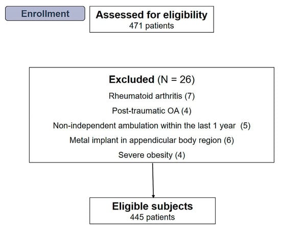 The medical records of 471 consecutive patients (665 knees) who underwent primary TKA between May 2020 and August 2021 were screened. Inclusion criteria for this study were as follows: (1) patients with symptomatic advanced OA (Kellgren—Lawrence [K—L] grade ≥ 3), (2) age > 60 years, (3) having a minimum follow-up period of 12 months, and (4) whose body composition, muscle strength, and physical performance could be measured before the index operation. All procedures were performed by two experienced surgeons using the same cemented and posterior-stabilized implants. Patients with other types of diagnosis (rheumatoid arthritis, n = 7; post-traumatic OA, n = 4), non-independent ambulation within the previous one year due to other comorbid medical conditions (n = 5), metal implants in the appendicular body parts that could potentially affect the accuracy of appendicular skeletal muscle mass measurement (n = 6), or severe obesity (body mass index [BMI] > 35 kg/m2; n = 4) were excluded. Finally, 445 patients, including 190 who underwent bilateral primary TKA, were included in the analysis (Figure 1). This retrospective study was approved by the institutional review board of our hospital prior to gathering patient data.