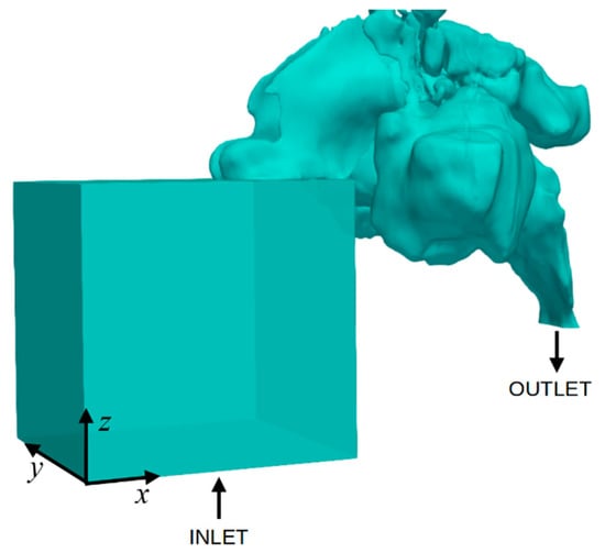 Equations (1) through (4) were discretised using the finite volume method (FVM) and solved numerically using the OpenFOAM (Open Source Field Operation and Manipulation) software [] along with the SIMPLE (Semi-Implicit Method for Pressure-Linked Equations) algorithm [,]. Table 1 shows the boundary conditions used in the created numerical model illustrated in Figure 1. All boundaries of the box simulating the external environment, except for the inlet, are called “box walls”, and the outer boundaries of the nasal cavity are called “nasal walls”.