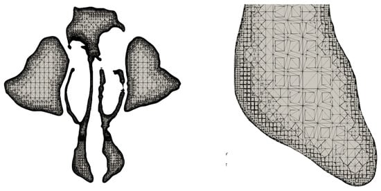 Figure 2 presents a cross-section through the calculation domain from Figure 1 and shows the structure of the numerical grid. It can be seen that the mesh very closely reproduces the actual shape of the nasal cavity, and the mesh cells became smaller as they neared the wall. In addition, the narrow channels contained a sufficiently large number of grid cells to represent the flow profile. These features ensure the physical behaviour of the flow and heat and mass transfer at the walls and reliable calculation results.