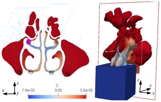 (Left) Cross-section through the nostrils indicating the measurement locations: A1, A2—the area around the ostiomeatal complex, B1, B2—the inferior nasal duct, C1, C2—maxillary sinus floor. (Right) General view of the 3D geometry of the nostrils with a sectional plane. The colour map indicates the humidity (C) in the nostrils.