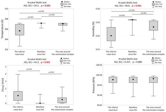 Figure 4 presents the comparison of temperature, humidity, flow velocity, and pressure values at the selected locations in the nose and sinuses. It should be noted that the obtained empirical distributions of the variables significantly deviated from the theoretical normal distribution (verified using the Shapiro–Wilk test). Therefore, the results shown in Figure 4 are presented as the median (Me) and the interquartile range IQR (Q1 and Q3). Nonparametric tests (Wilcoxon, Kruskal–Wallis, and Friedman) were used to compare the average values between the groups.