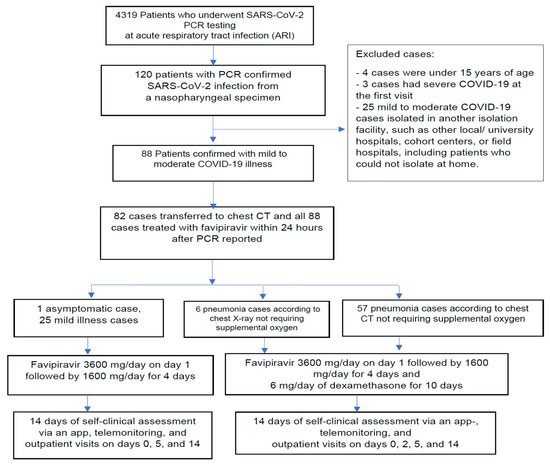 As a part of the standard of care, 4319 patients underwent SARS-CoV-2 polymerase chain reaction (PCR) testing. Eighty-eight PCR-confirmed COVID-19 cases were in accordance with the eligibility criterion of mild to moderate COVID-19. The COVID-19 severity classification was modified from the Infectious Diseases Society of America and National Institute of Health guidelines. Mild illness was defined as symptomatic cases with at least one of the following respiratory symptoms: fever, cough, myalgia, sore throat, runny nose, dyspnea, chest discomfort, and shortness of breath. Moderate illness was defined as all pneumonia cases not receiving supplemental oxygen [25,26] (Figure 1).