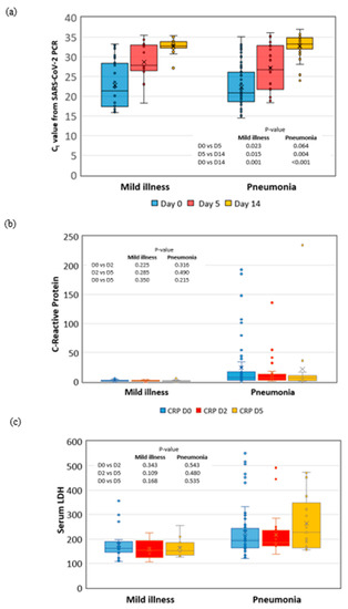 The Ct values on days 0, 5, and 14 did not differ in mild and moderate COVID-19 patients. The median Ct values showed a statistically significant virologic response in both mild illness and pneumonia between day 0 vs. day 14 (p = 0.001, p < 0.001) and day 5 vs. day 14 (p = 0.015, p = 0.004). However, the only significant change in Ct value in mild illness patients between day 0 and 5. (p = 0.023) (Figure 2).